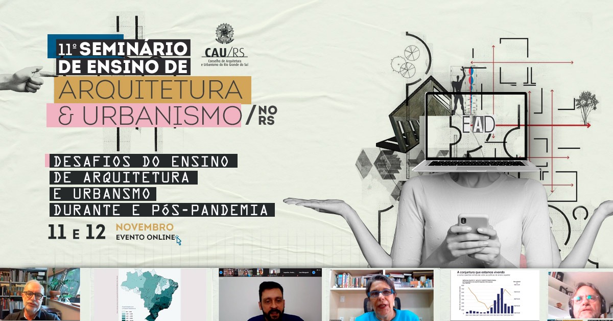 Atento às adaptações necessárias durante e também no cenário pós-pandêmico, o Conselho de Arquitetura e Urbanismo (CAU/RS) realizou o 11º Seminário de Ensino e Formação. Organizado pela Comissão de Ensino e Formação (CEF-CAU/RS), o evento online aconteceu nos dias 11 e 12 de novembro. Professores e coordenadores de curso, além de especialistas em outras áreas de atuação, debateram ao longo de dois dias o tema central do seminário: Desafios do ensino de Arquitetura e Urbanismo durante e pós-pandemia.