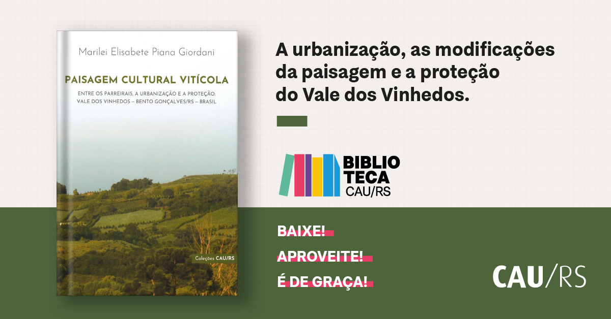 Um dos objetivos do Conselho de Arquitetura e Urbanismo (CAU/RS) é promover a Arquitetura e Urbanismo por meio da experiência, da pesquisa e da literatura. Para isso, o CAU/RS já realizou três edições do Edital de Publicações, e promove a quarta edição em 2022. Em 2016, um dos selecionados para publicação foi o livro Paisagem Cultural Vitícola, de autoria da arquiteta e urbanista Marilei Elisabeth Giordani.