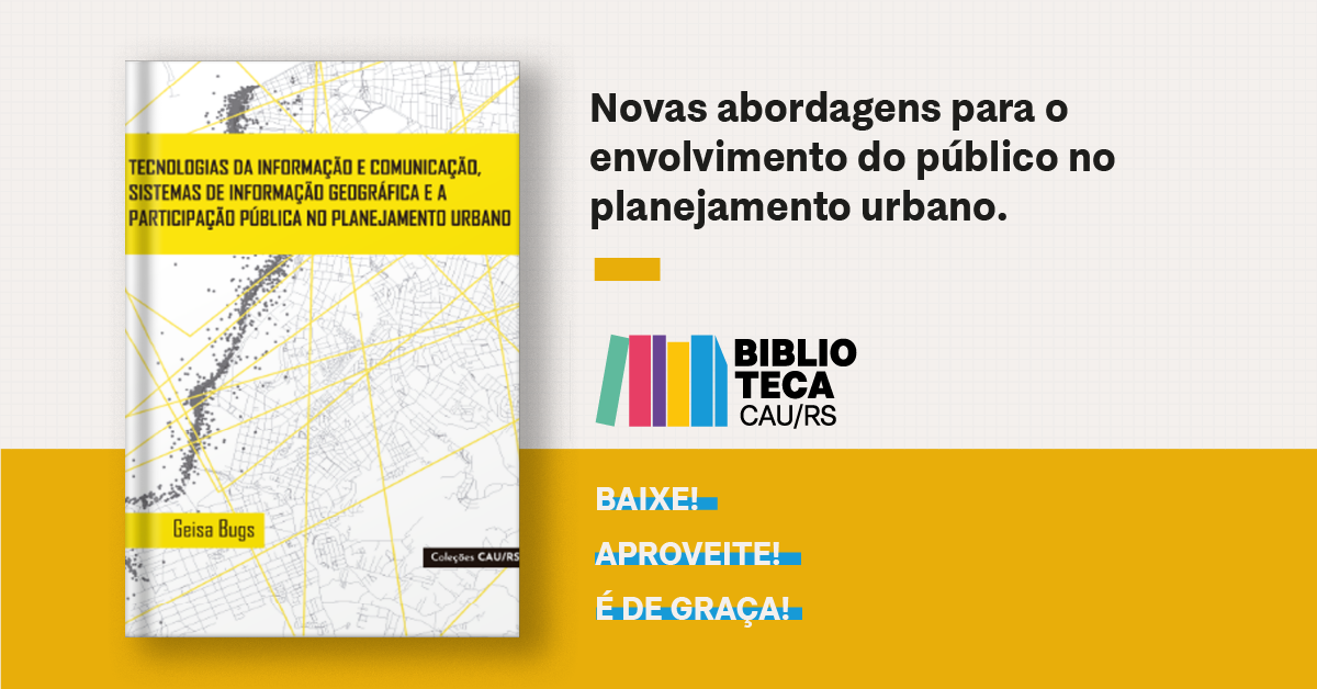 Um dos objetivos do Conselho de Arquitetura e Urbanismo (CAU/RS) é promover a Arquitetura e Urbanismo por meio da experiência, da pesquisa e da literatura. Para isso, o CAU/RS já realizou três edições do Edital de Publicações, e promove a quarta edição em 2022. Em 2016, um dos selecionados para publicação foi o livro Tecnologias da informação e comunicação, sistemas de informação geográfica e a participação pública no planejamento urbano, de autoria da arquiteta e urbanista Geisa Bugs.