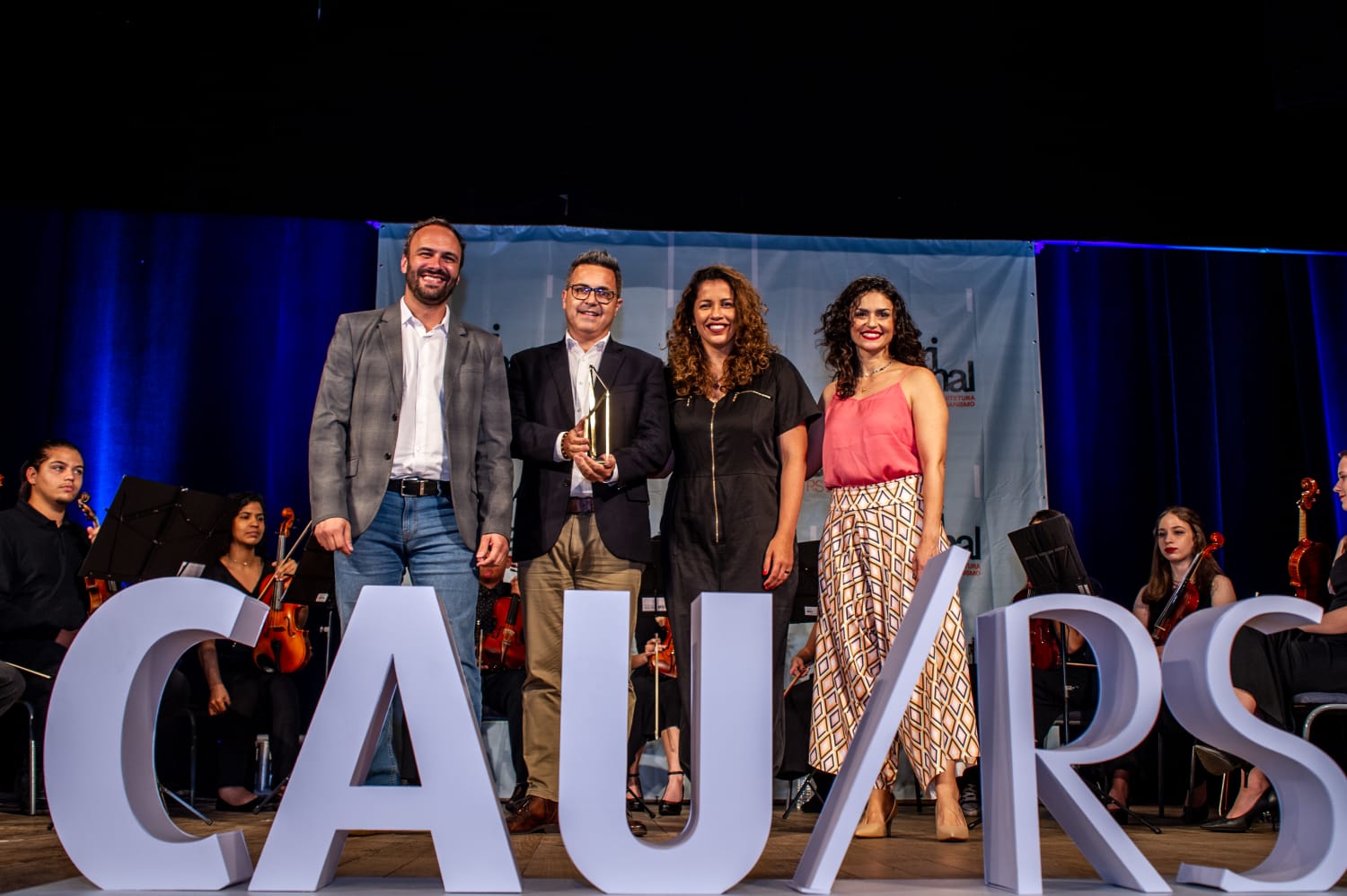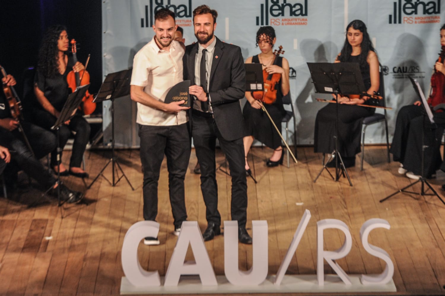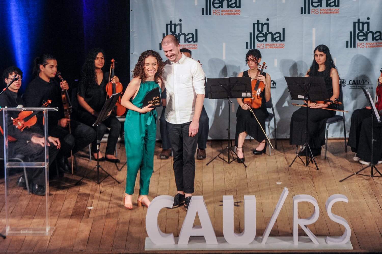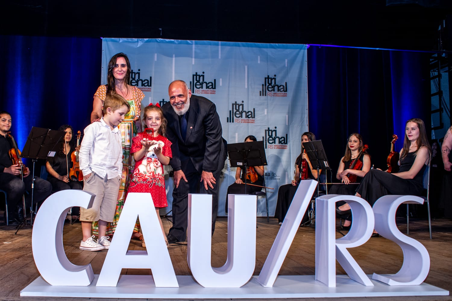 A movimentação no icônico Theatro São Pedro começou por volta das 18h30 e, em seguida, a Orquestra Jovem da Fábrica de Sonhos começou sua apresentação. Na sequência, subiram ao palco os presidentes das respectivas entidades: Tiago Holzmann da Silva (CAU/RS), Rafael Passos (IAB RS), Gislaine Saibro (AAI Brasil/RS), Evandro Medeiros (Saergs) e Raquel Hagen (AsBEA-RS). Em sua fala, Tiago agradeceu ao quadro funcional do Conselho, pela organização e realização do evento, e lembrou também o homenageado da 4ª edição do Prêmio CAU/RS, arquiteto e urbanista Luiz Antonio Machado Verissimo (in memoriam). “O que realizamos hoje em nome da manutenção da qualidade do ensino, devemos ao Verissimo”, afirmou.