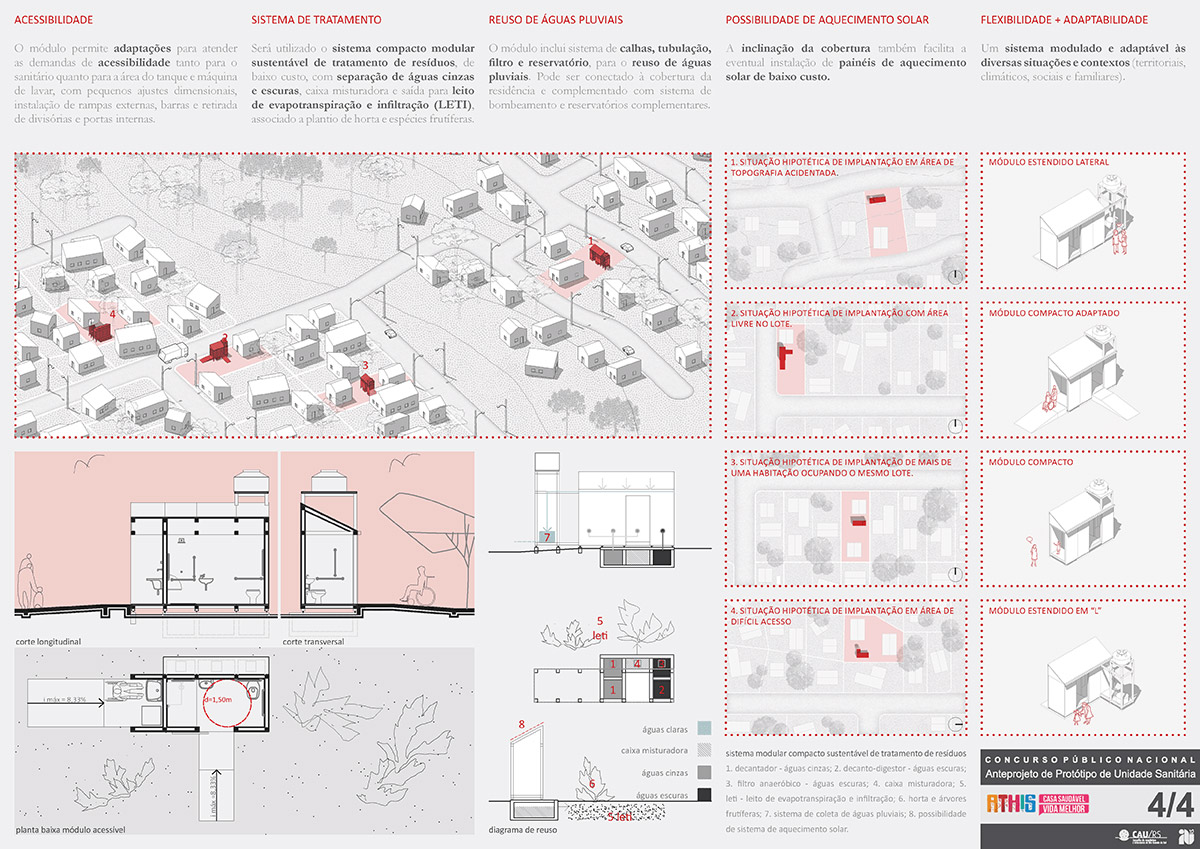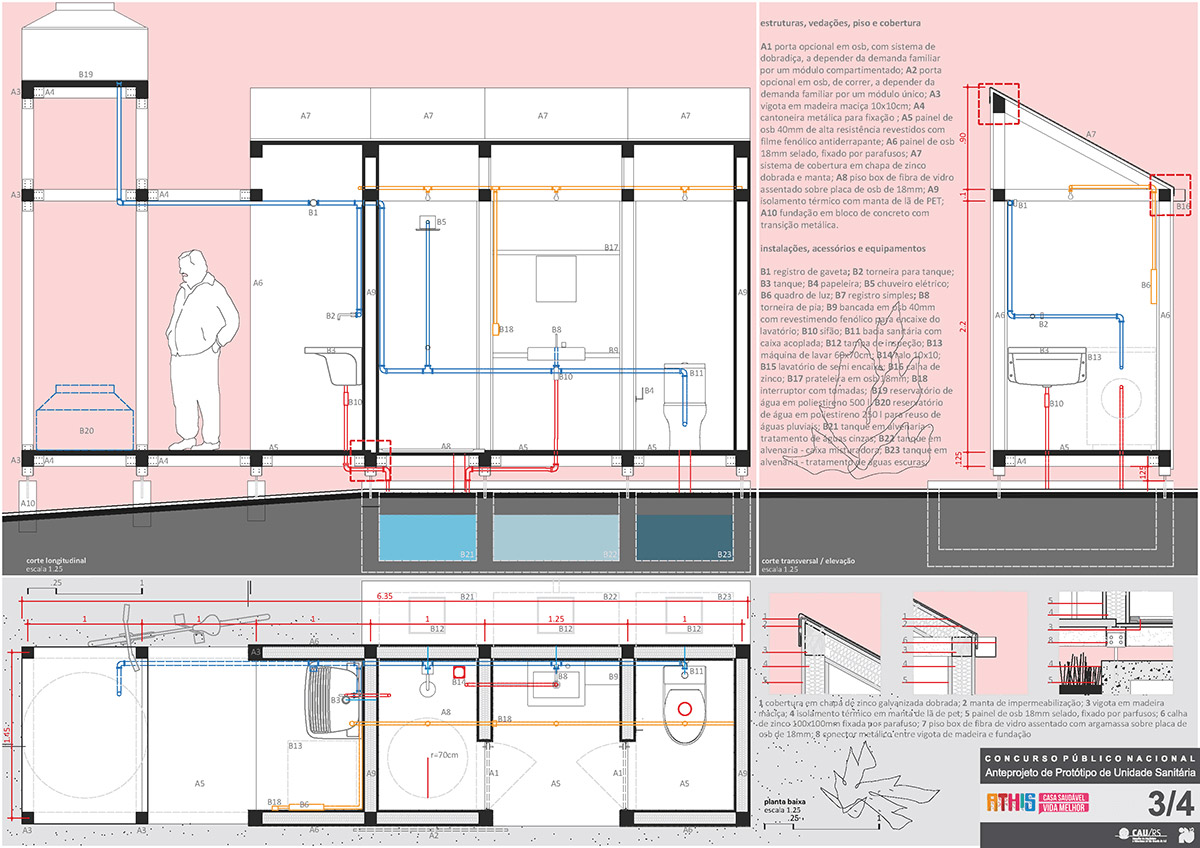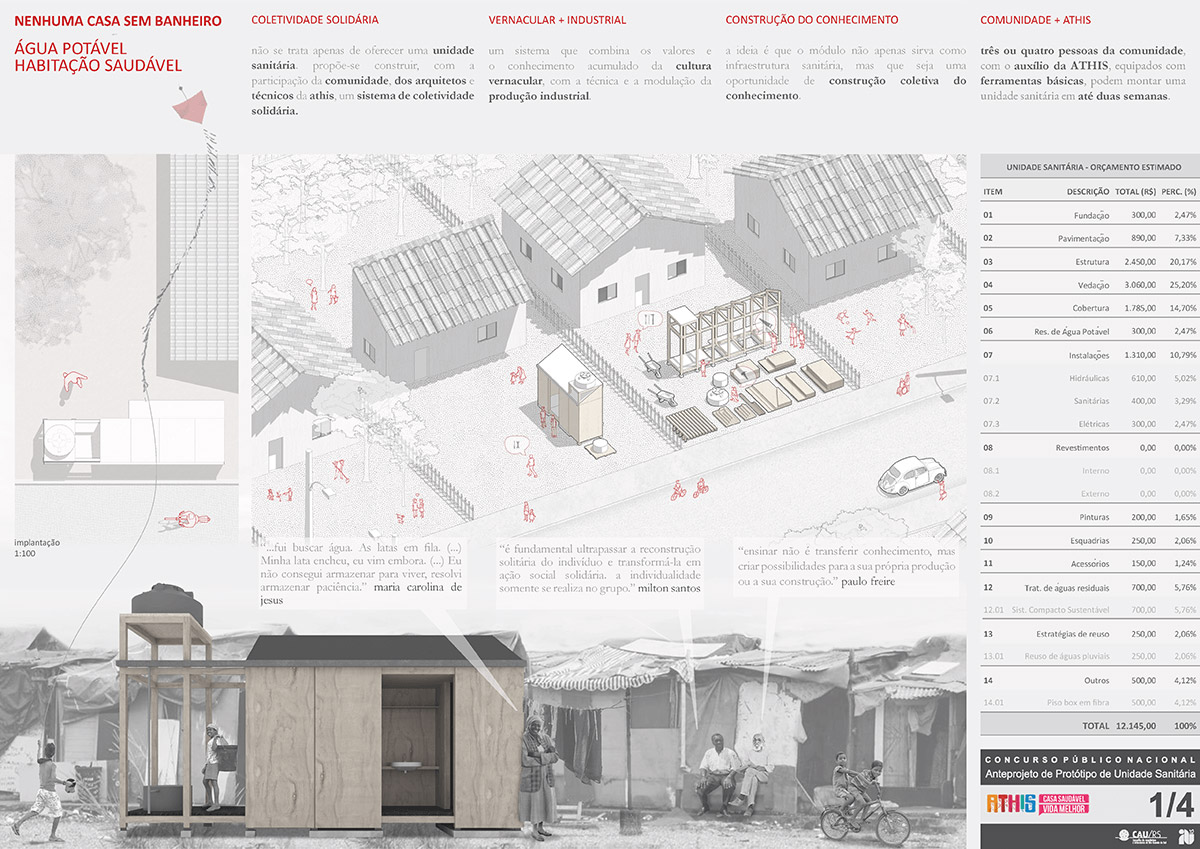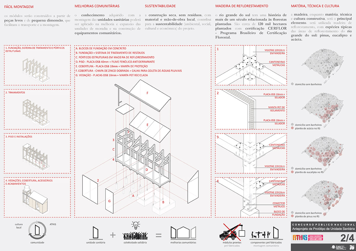 O protótipo de banheiro que será construído em Eldorado do Sul é uma das propostas vencedoras do concurso ATHIS Unidade Sanitária, realizado pelo CAU/RS em outubro de 2020. O projeto foi elaborado pelo escritório GSR Arquitetos, de autoria dos arquitetos e urbanistas Fabiano José Arcadio Sobreira e Paulo Victor Borges Ribeiro.