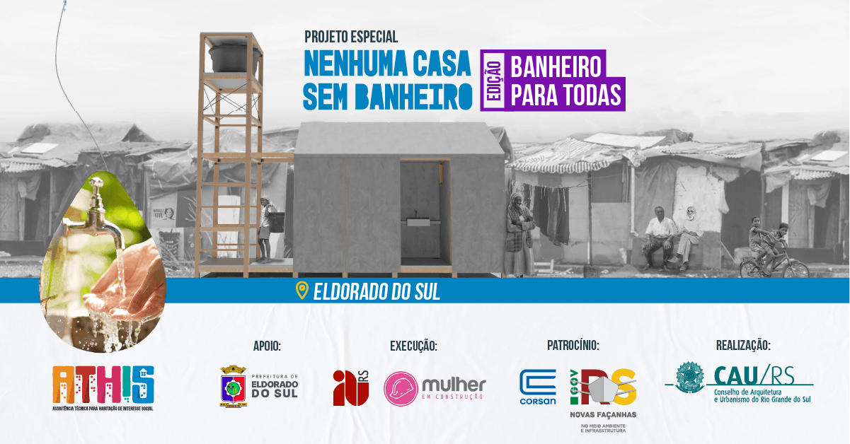 É que a iniciativa terá uma edição intitulada “Banheiro para todas”, que beneficiará uma comunidade de Eldorado do Sul, na Região Metropolitana de Porto Alegre. Esta edição do Nenhuma Casa sem Banheiro é uma parceria entre o CAU/RS, o Instituto de Arquitetos do Brasil (IAB RS), a ONG Mulher em Construção e a Companhia Riograndense de Saneamento (Corsan), com apoio da prefeitura municipal.