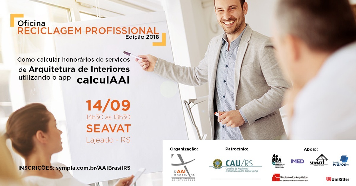 Debater gestão, definição de honorários e atividades relacionadas à Arquitetura de Interiores é a proposta do projeto Reciclagem Profissional 2018 que a Associação de Arquitetos de Interiores Brasil/RS (AAI Brasil/RS) promove em Lajeado no dia 14 de setembro. A oficina ocorre das 14h30 às 18h30 na sede da Seavat (Rua Albino Korndörfer, 77) e demonstrará o calculAAI, aplicativo desenvolvido pela entidade para auxiliar na administração dos custos dos escritórios e na fixação dos preços a serem cobrados, conforme perfil e escopo apresentado, pelos serviços dos profissionais da área.