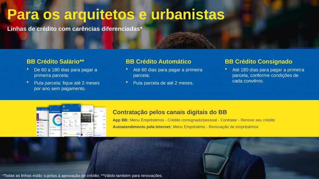 O pacote inclui, entre outros produtos, prazos especiais para empréstimos e condições especiais para solução de dívidas. Os gerentes do BB estão realizando abordagem ativa aos arquitetos e urbanistas correntistas (PF e PJ) e podem dar orientações em relação às soluções disponibilizadas.