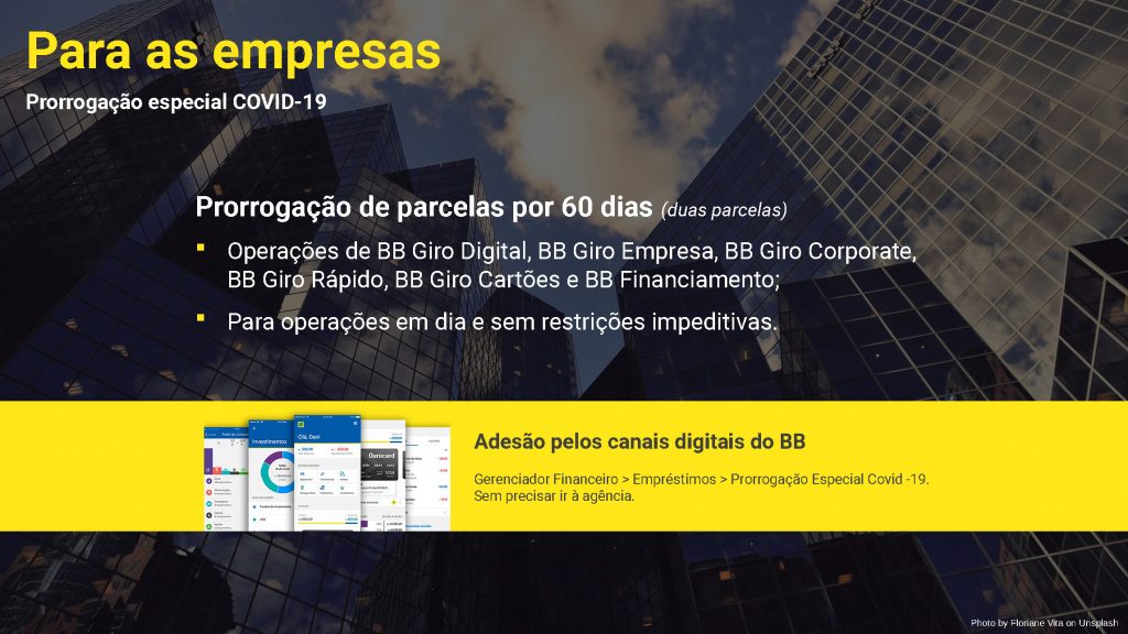 A adesão pode ser feita pelos canais digitais do Banco do Brasil, sem precisar ir à agência (Gerenciador Financeiro > Empréstimos > Promoção Especial Covid-19).