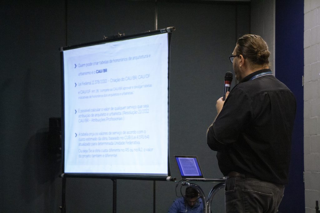 A primeira palestra reuniu cerca de 90 pessoas interessadas em aprender a fazer o cálculo de honorários profissionais. O arquiteto e urbanista Agente de Fiscalização Rodrigo Jaroseski apresentou o histórico de criação da Tabela, destacando sua importância para a valorização da categoria. O valor de um serviço em arquitetura precisa considerar custos como luz, deslocamento e manutenção do escritório, por exemplo. O Fiscal do CAU/RS também realizou uma simulação de projeto, utilizando o aplicativo que auxilia os profissionais a realizarem o cálculo de honorários.
