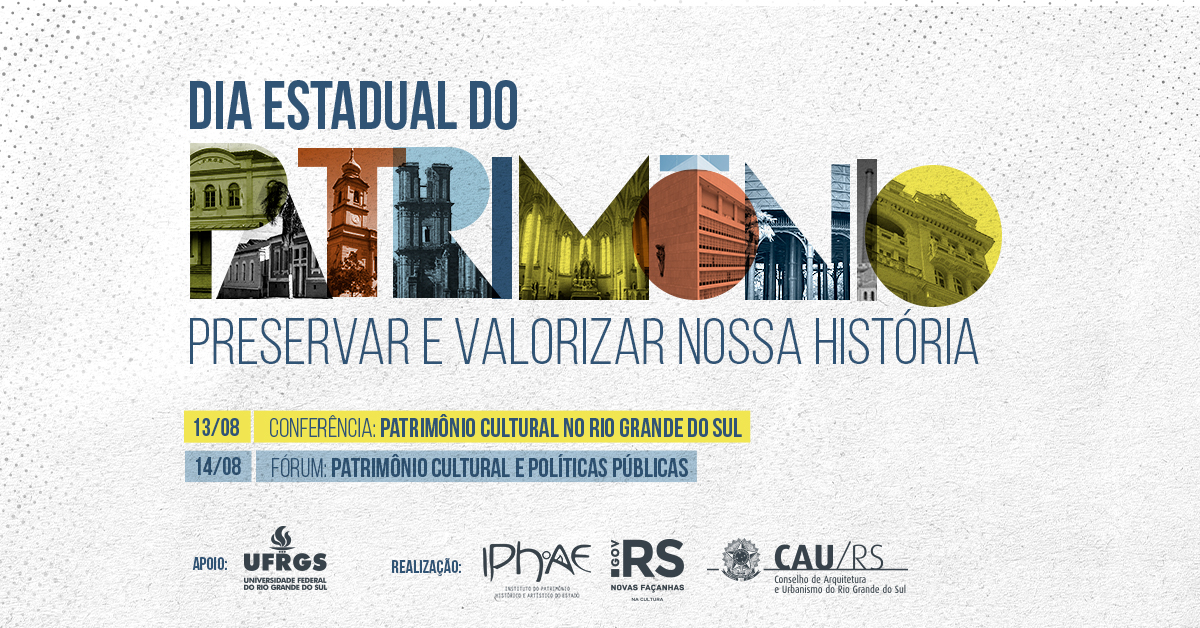 Em 2020, não será diferente! O Conselho de Arquitetura e Urbanismo (CAU/RS), em parceria com a Secretaria de Estado da Cultura do Rio Grande do Sul (Sedac) e o Instituto do Patrimônio Histórico e Artístico do Estado (Iphae), com apoio da Universidade Federal do Rio Grande do Sul (UFRGS) realizará o evento Dia Estadual do Patrimônio 2020.