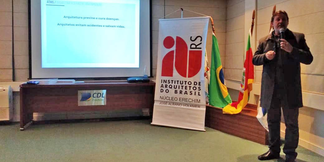 Na sequência, o presidente Tiago realizou uma palestra para estudantes e profissionais de Erechim e região. O evento foi promovido pelo Núcleo IAB RS Erechim, em parceria com a Universidade Regional Integrada do Alto Uruguai e das Missões (URI) e a Universidade Federal da Fronteira Sul (UFFS). O tema foi “ATHIS – Arquitetura, saúde e segurança através da Assistência Técnica e do trabalho dos arquitetos e urbanistas”. A arquiteta Silvana Girardi, presidente do Núcleo, destacou a presença de arquitetos, professores e estudantes no evento e salientou a importância de atividades que abordem os temas relevantes da profissão. Com relação ao tema da palestra, o presidente Tiago afirmou que “a proliferação de cursos de Arquitetura e Urbanismo e a quantidade crescente de profissionais exige do Conselho e das entidades a busca de outros mercados e clientes ainda não atendidos pelos profissionais. A implantação da Lei da Assistência Técnica é uma oportunidade muito importante de fazer com que o serviço qualificado do arquiteto e urbanista chegue nas famílias de baixa renda para resolver os problemas da moradia, saneamento e espaço público.”