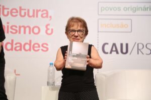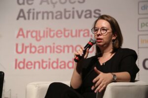 A integrante da CTAA, Flávia Licht, iniciou a explanação abordando a importância de pautar inclusão e acessibilidade no universo da Arquitetura e Urbanismo, defendendo que “a escolha de construir um lugar com acessibilidade ou não, é de um arquiteto”. Ela utilizou de exemplo a própria estrutura do palco onde estava: “quando há duas escadas laterais para o palco, e uma pessoa que não tem condições de subir escadas precisa entrar pelos fundos do palco, há uma divisão da sociedade”.