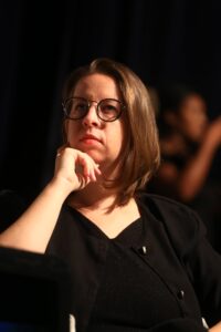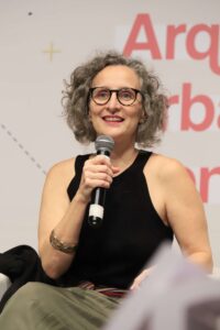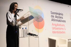 Paula Santoro iniciou sua fala compartilhando sua experiência na Faculdade de Arquitetura e Urbanismo da Universidade de São Paulo (FAUUSP) na implantação de políticas afirmativas para pessoas com deficiência, trans, pretas, pardas e indígenas. A inclusão de grupos minorizados nas universidades provoca necessidades de revisão nas formas de expressão da ciência e de produção do conhecimento.