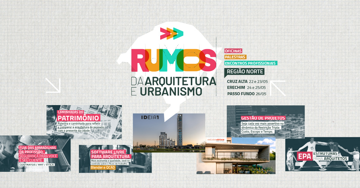 Após o Rumos da Arquitetura e Urbanismo percorrer as regiões Sul, Centro e Fronteira do estado, o Conselho de Arquitetura e Urbanismo (CAU/RS) segue para a região Norte, nas cidades de Cruz Alta, Erechim e Passo Fundo, onde possui um Escritório Regional, entre os dias 22 e 26 de maio. O Rumos é um evento pensado tanto para aproximar o CAU/RS dos profissionais do interior do estado quanto para provocar reflexões e novas ideias sobre o futuro da profissão.