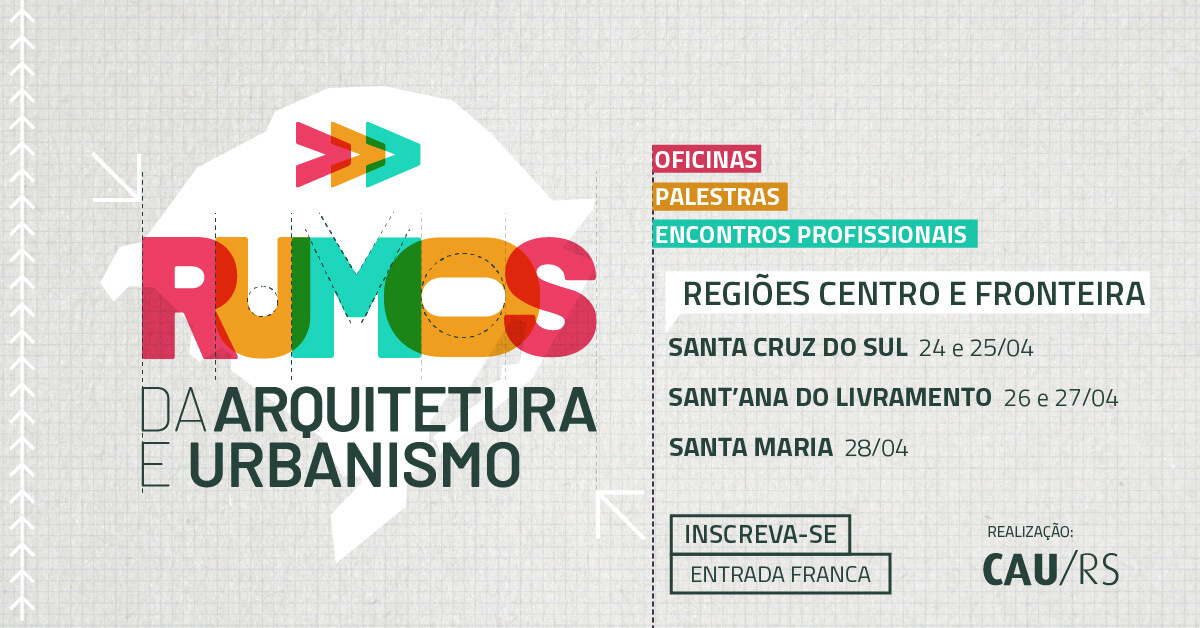 Até junho, 12 cidades receberão o Rumos da Arquitetura e Urbanismo: além de Rio Grande, Bagé, Pelotas, Santa Cruz do Sul, Sant’Ana do Livramento e Santa Maria; também, na região Norte, Cruz Alta, Erechim e Passo Fundo; e, na região Serra, Lajeado, Bento Gonçalves e Caxias do Sul.