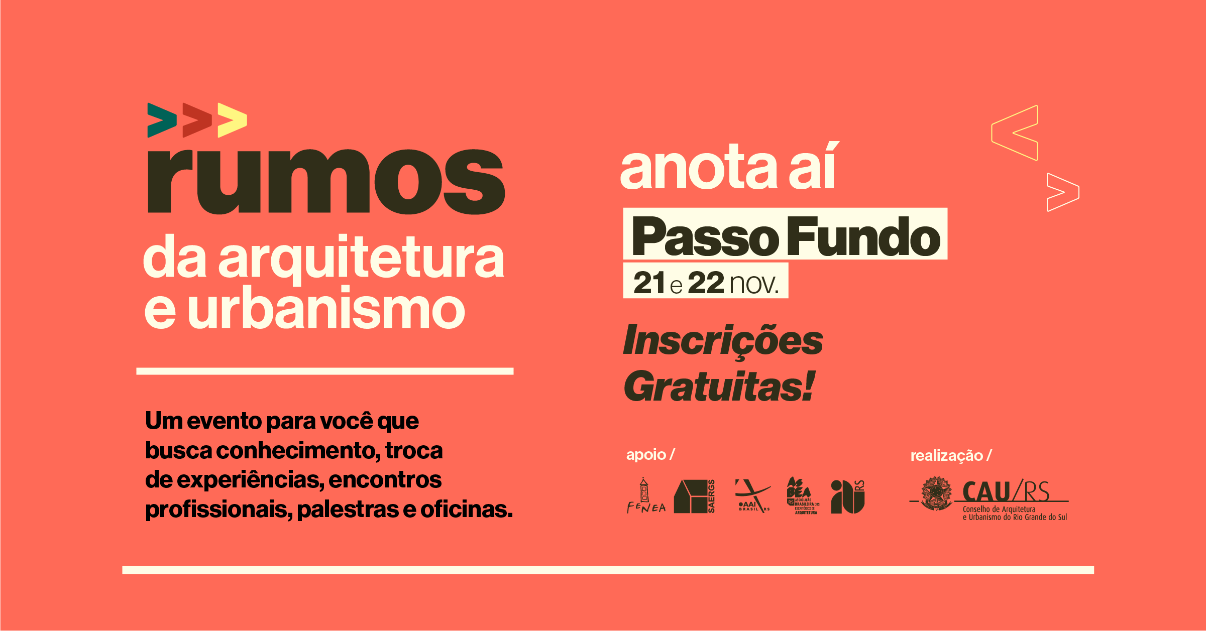 Dois dias para vivenciar a arquitetura e o espaço urbano em Passo Fundo. A cidade será palco do Rumos da Arquitetura e Urbanismo nos dias 21 e 22 de novembro. O CAU/RS prepara uma programação diversificada para envolver a comunidade, profissionais e estudantes da área. As atividades serão concentradas na Faculdade Atitus – Campus Santa Teresinha.