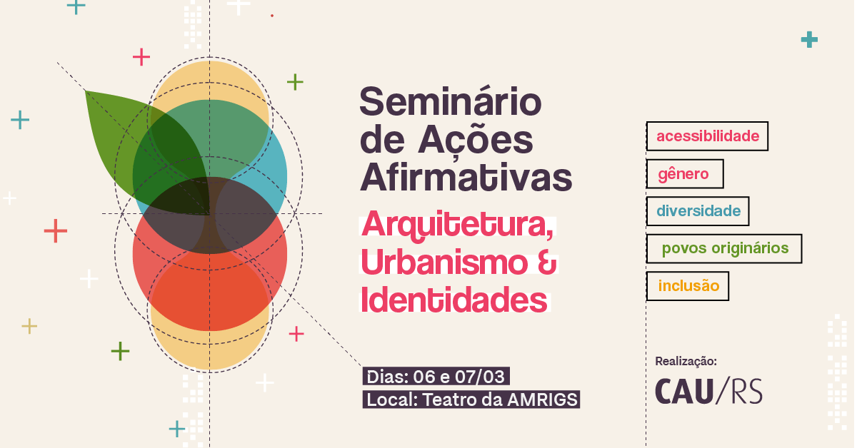 O Conselho de Arquitetura e Urbanismo (CAU/RS) promove nos dias 6 e 7 de março, no Teatro da AMRIGS, em Porto Alegre, o Seminário de Ações Afirmativas – Arquitetura, Urbanismo e Identidades. Com o objetivo de reunir pesquisadores, especialistas e profissionais que projetam o futuro dos ambientes e das cidades, o evento busca fomentar discussões sobre gênero, acessibilidade, inclusão e povos originários.