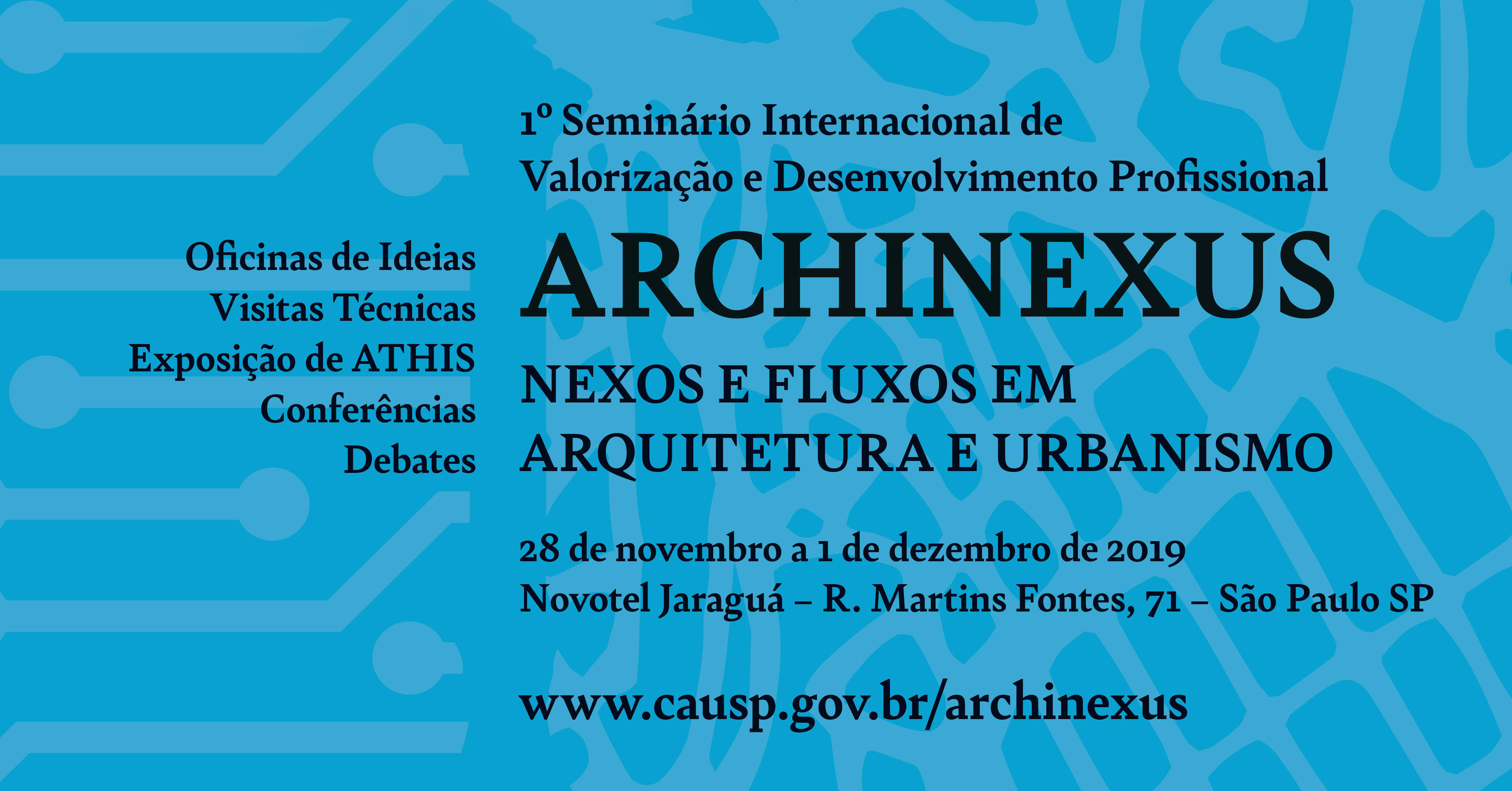 De 28 de novembro a 1º de dezembro, o 1º Seminário Internacional de Valorização e Desenvolvimento Profissional: Archinexus traz especialistas do Brasil e Europa para debater temas caros à valorização do arquiteto e urbanista, como a qualidade dos serviços e equipamentos públicos, os novos arranjos profissionais e o atendimento às demandas sociais, e as novas tendências e inovações.