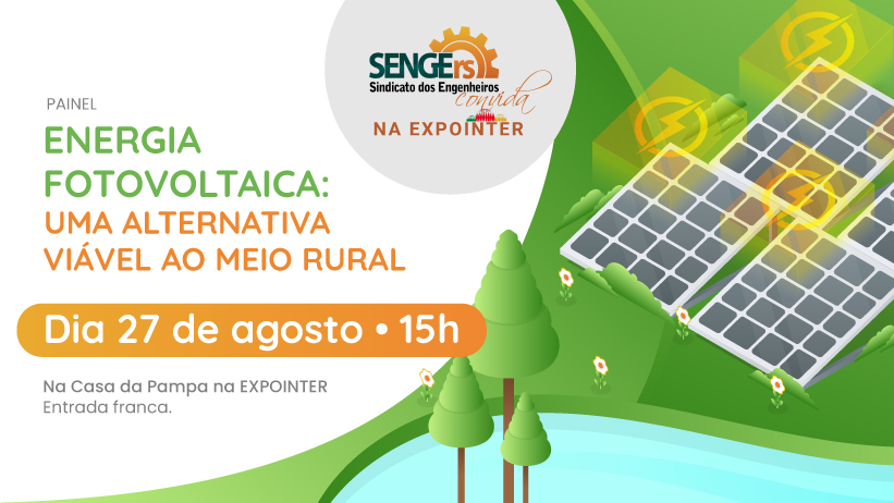 O Sindicato dos Engenheiros, em parceria com a Rede Pampa de Comunicação, convida para o painel ENERGIA FOTOVOLTAICA – UMA ALTERNATIVA VIÁVEL AO MEIO RURAL, que acontecerá no próximo dia 27 de agosto, às 15h, na Casa da Pampa na Expointer 2019.