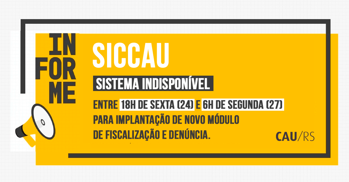 O Sistema de Informação e Comunicação do CAU (SICCAU) estará indisponível a partir das 18h desta sexta-feira, 24 de março, até as 06h da próxima segunda-feira, dia 27. O motivo é a migração de dados para implantação do novo Módulo de Fiscalização (Resolução nº 198/2020), que entra em vigor na semana que vem.