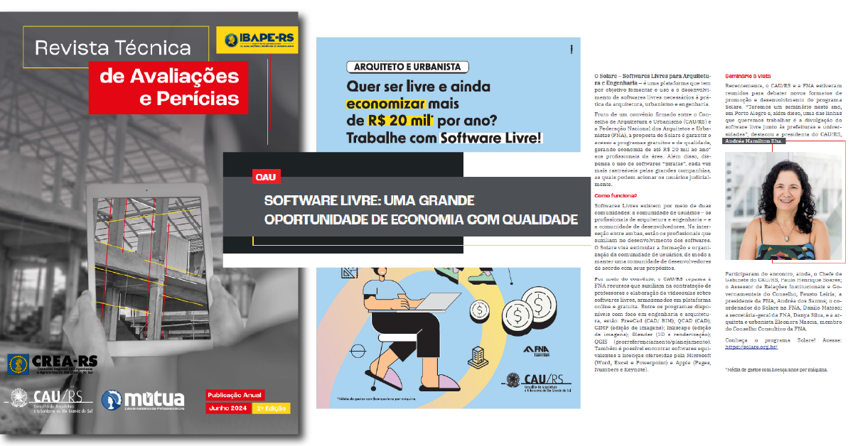A edição de junho da Revista Técnica de Avaliações e Perícias, uma publicação do Instituto Brasileiro de Avaliações e Perícias (Ibape-RS), traz uma matéria sobre o Solare – Softwares Livres para Arquitetos e Engenheiros.