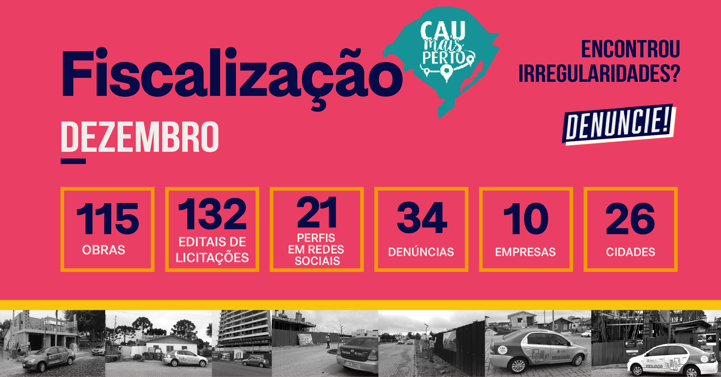 O Conselho de Arquitetura e Urbanismo (CAU/RS) divulga mensalmente os dados das ações de fiscalização de editais e de redes sociais e também do CAU Mais Perto, com o balanço da fiscalização de obras, condomínios, feiras, mostras e eventos. Confira a seguir os números referentes a dezembro de 2023.