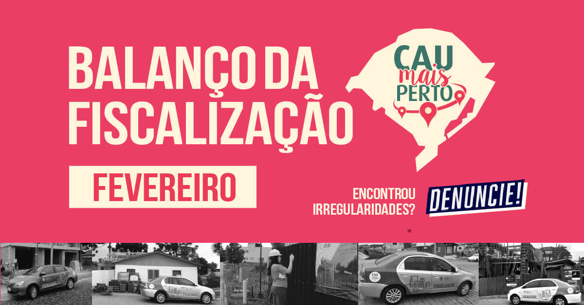 O Conselho de Arquitetura e Urbanismo (CAU/RS) divulga mensalmente os dados das ações de fiscalização de editais e de redes sociais e também do CAU Mais Perto, com o balanço da fiscalização de obras, condomínios, feiras, mostras e eventos. Confira a seguir os números referentes a fevereiro de 2024.