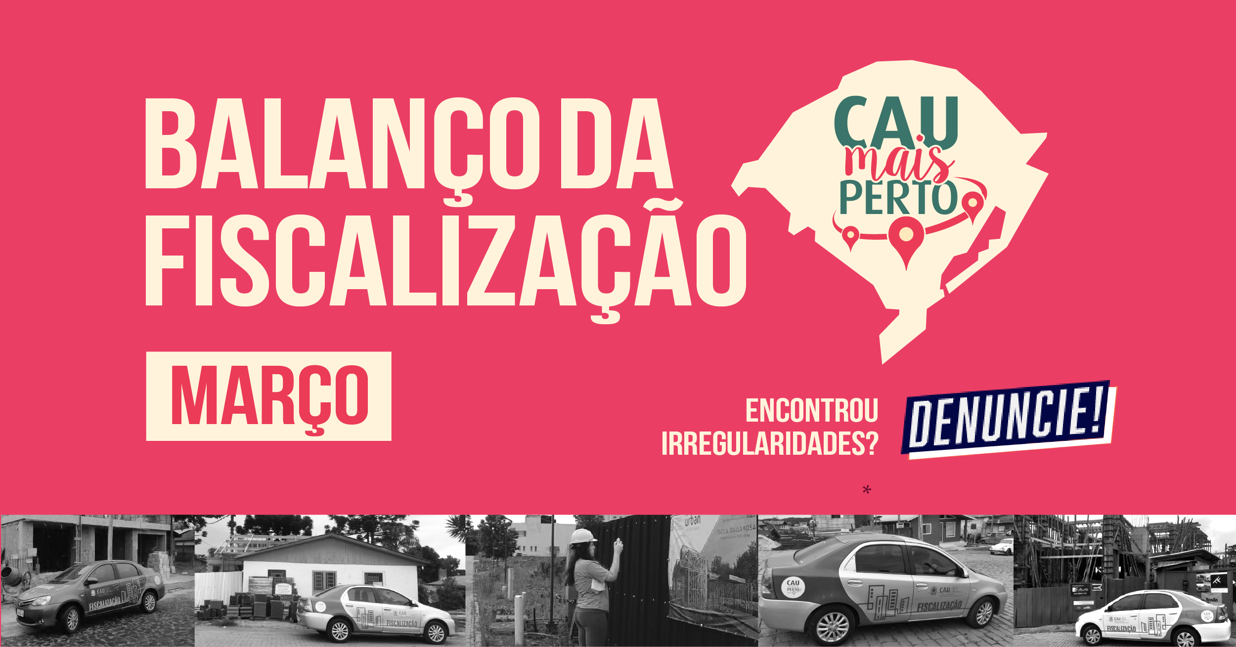 O Conselho de Arquitetura e Urbanismo (CAU/RS) divulga mensalmente os dados das ações de fiscalização de editais e de redes sociais e também do CAU Mais Perto, com o balanço da fiscalização de obras, empresas, feiras e eventos. Confira a seguir os números referentes a março de 2024.