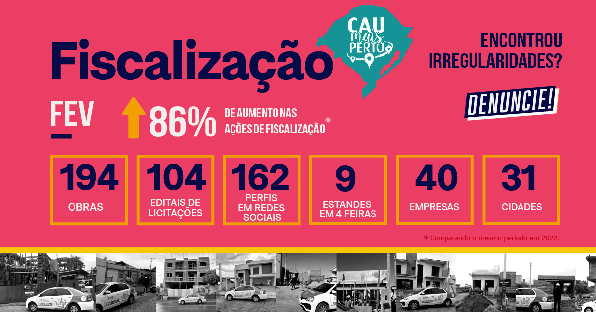O Conselho de Arquitetura e Urbanismo (CAU/RS) divulga mensalmente os dados das ações de fiscalização de editais e de redes sociais e também do CAU Mais Perto, com o balanço da fiscalização de obras, condomínios, feiras, mostras e eventos. Neste mês, as ações da Fiscalização do CAU/RS por meio do CAU Mais Perto tiveram um aumento de 86% em relação às ações realizadas em fevereiro de 2022! Em fevereiro de 2022, foram emitidos 193 relatórios de fiscalização, enquanto em fevereiro de 2023 foram 359 relatórios. Confira a seguir os números referentes a fevereiro.