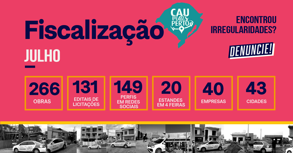 O Conselho de Arquitetura e Urbanismo (CAU/RS) divulga mensalmente os dados das ações de fiscalização de editais e de redes sociais e também do CAU Mais Perto, com o balanço da fiscalização de obras, condomínios, feiras, mostras e eventos. Confira a seguir os números referentes a julho: