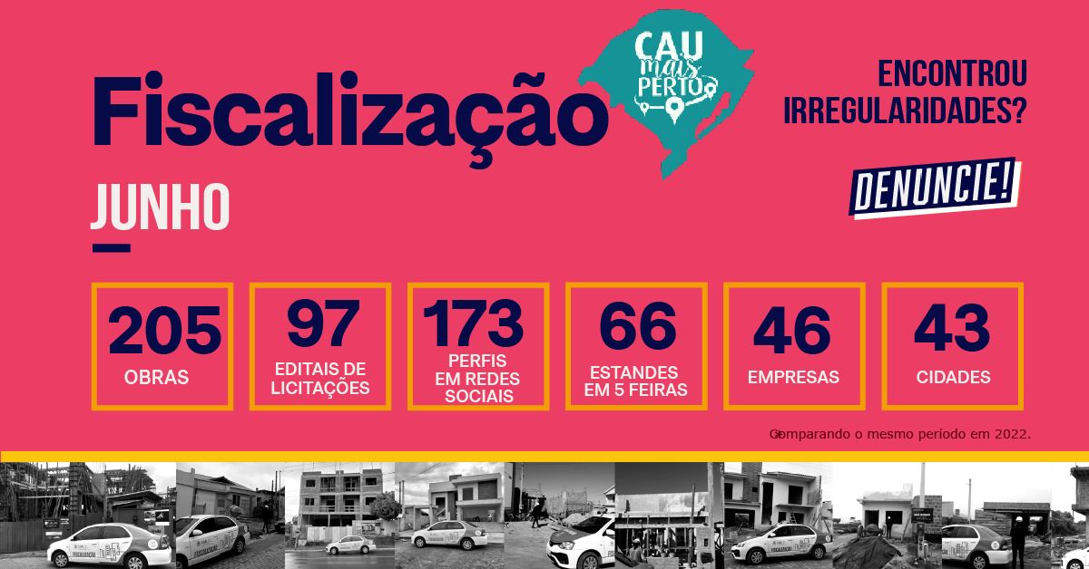 O Conselho de Arquitetura e Urbanismo (CAU/RS) divulga mensalmente os dados das ações de fiscalização de editais e de redes sociais e também do CAU Mais Perto, com o balanço da fiscalização de obras, condomínios, feiras, mostras e eventos. Confira a seguir os números referentes a junho: