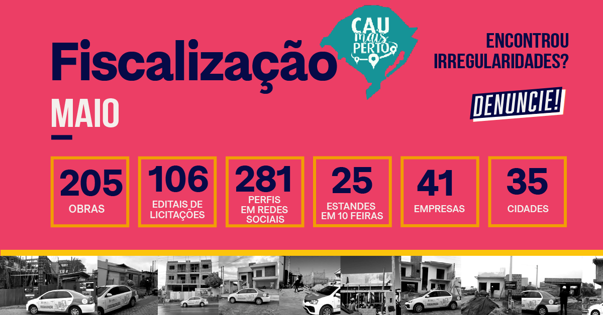 O Conselho de Arquitetura e Urbanismo (CAU/RS) divulga mensalmente os dados das ações de fiscalização de editais e de redes sociais e também do CAU Mais Perto, com o balanço da fiscalização de obras, condomínios, feiras, mostras e eventos. Confira a seguir os números referentes a maio: