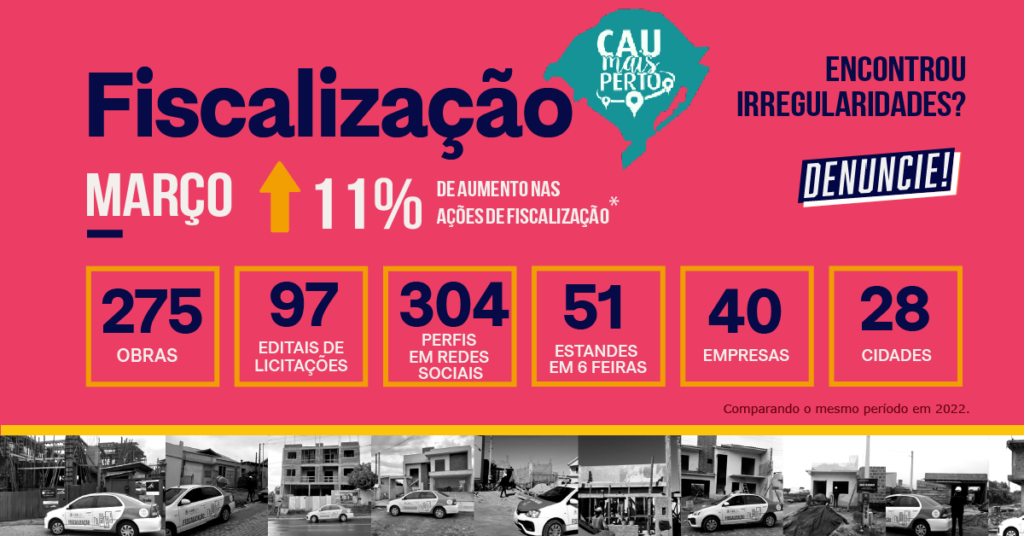 O Conselho de Arquitetura e Urbanismo (CAU/RS) divulga mensalmente os dados das ações de fiscalização de editais e de redes sociais e também do CAU Mais Perto, com o balanço da fiscalização de obras, condomínios, feiras, mostras e eventos. Neste mês, as ações da Fiscalização do CAU/RS por meio do CAU Mais Perto tiveram um aumento de 11% em relação às ações realizadas em março de 2022, quando foram emitidos 359 relatórios de fiscalização, enquanto em março de 2023 foram 399 relatórios. Confira a seguir os números referentes a março: