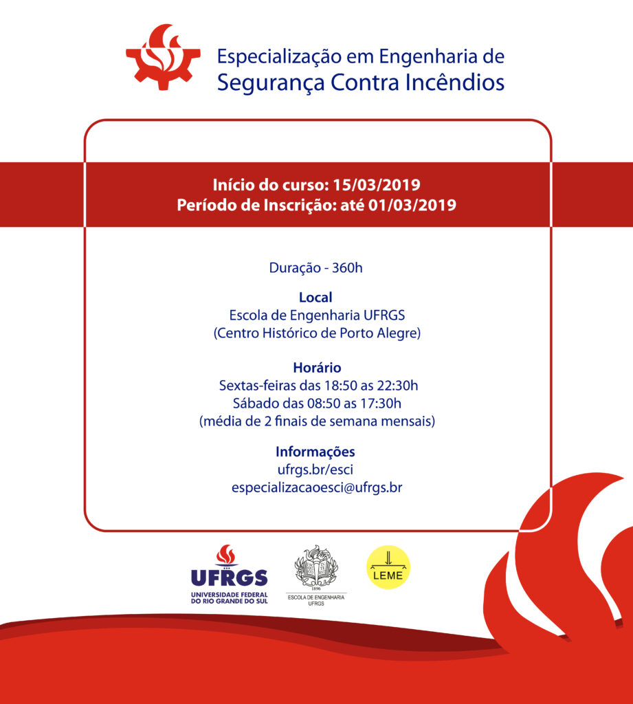 A Escola de Engenharia da Universidade Federal do Rio Grande do Sul (UFRGS), juntamente com o Laboratório de Ensaios e Modelos Estruturais e o Departamento de Engenharia Civil, promove mais uma chamada para o curso de especialização em Engenharia de Segurança Contra Incêndios (ESCI), direcionado a arquitetos e urbanistas e engenheiros. As inscrições estão abertas até 01 de março de 2019. As aulas iniciam em 15 de março e o curso tem duração de 18 meses.