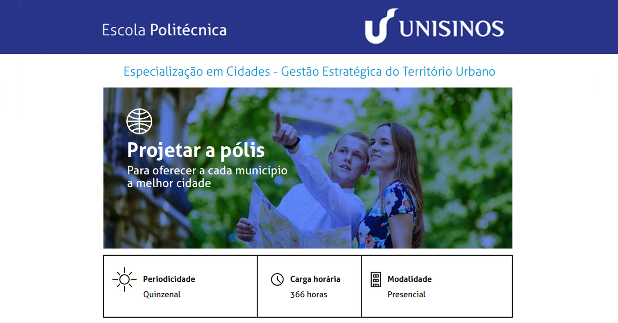 O curso aborda a gestão do território urbano a partir de múltiplos olhares, propondo uma formação diferenciada, profissionalizando o aluno em consultoria, elaboração e implementação de planos e projetos de gestão estratégica do território municipal.