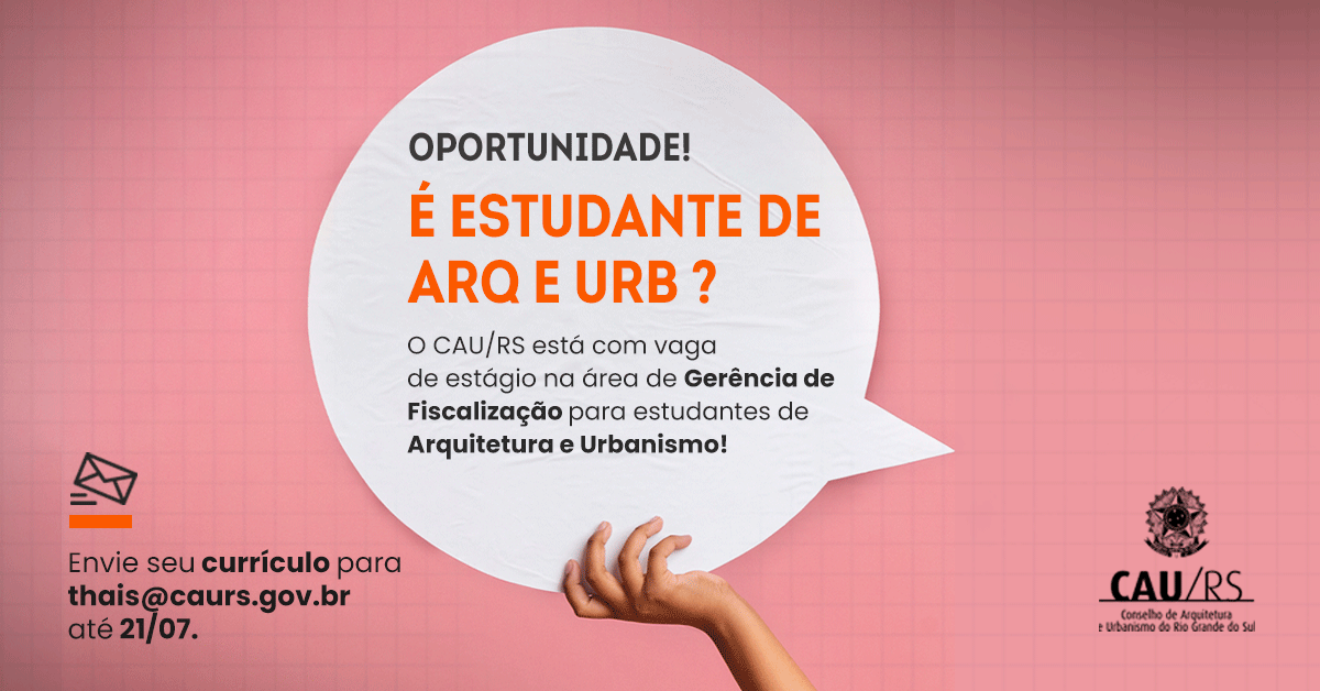 O Conselho de Arquitetura e Urbanismo (CAU/RS) está com uma vaga de estágio aberta em Porto Alegre. Interessados devem enviar seu currículo para thais@caurs.braso.dev.br até 21 de julho de 2023. A seleção dos currículos e entrevistas ocorrerá de 24 a 28/07.