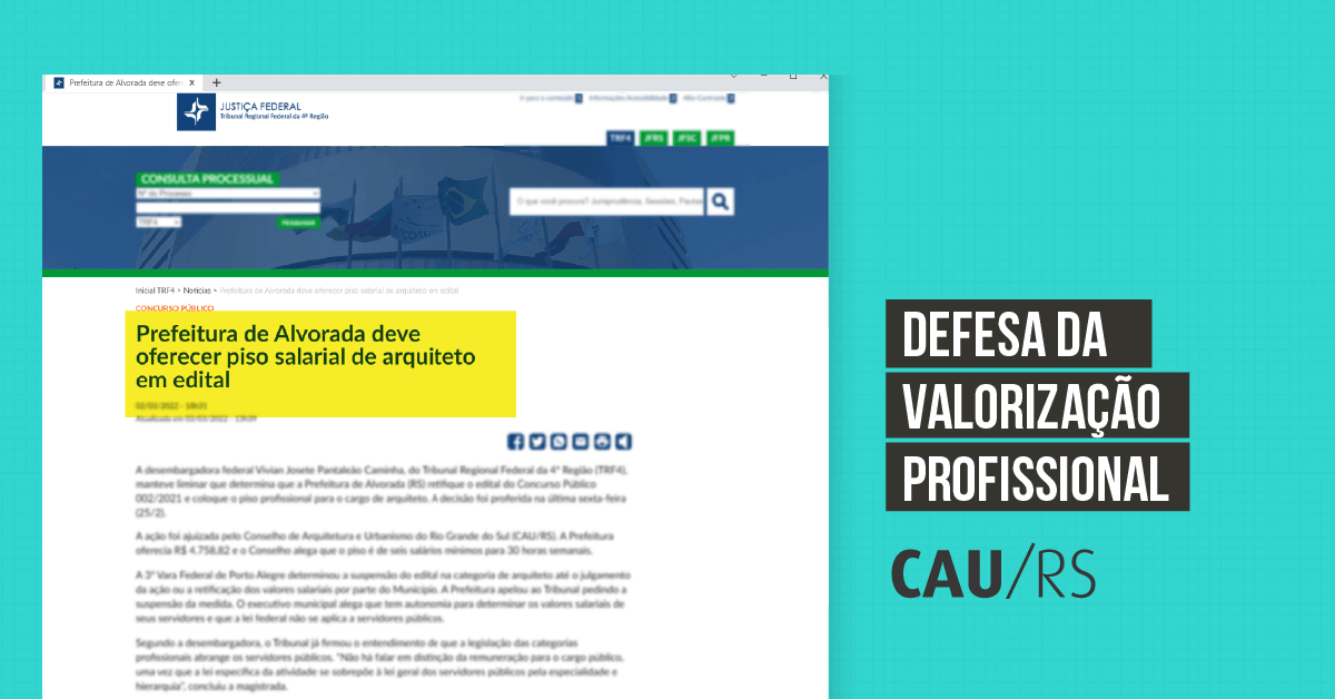 Em fevereiro deste ano, a desembargadora federal Vivian Josete Pantaleão Caminha, do Tribunal Regional Federal da 4ª Região (TRF4), manteve a liminar que determina que a Prefeitura de Alvorada (RS) retifique o edital do Concurso Público 002/2021 e coloque o piso profissional para o cargo de arquiteto.